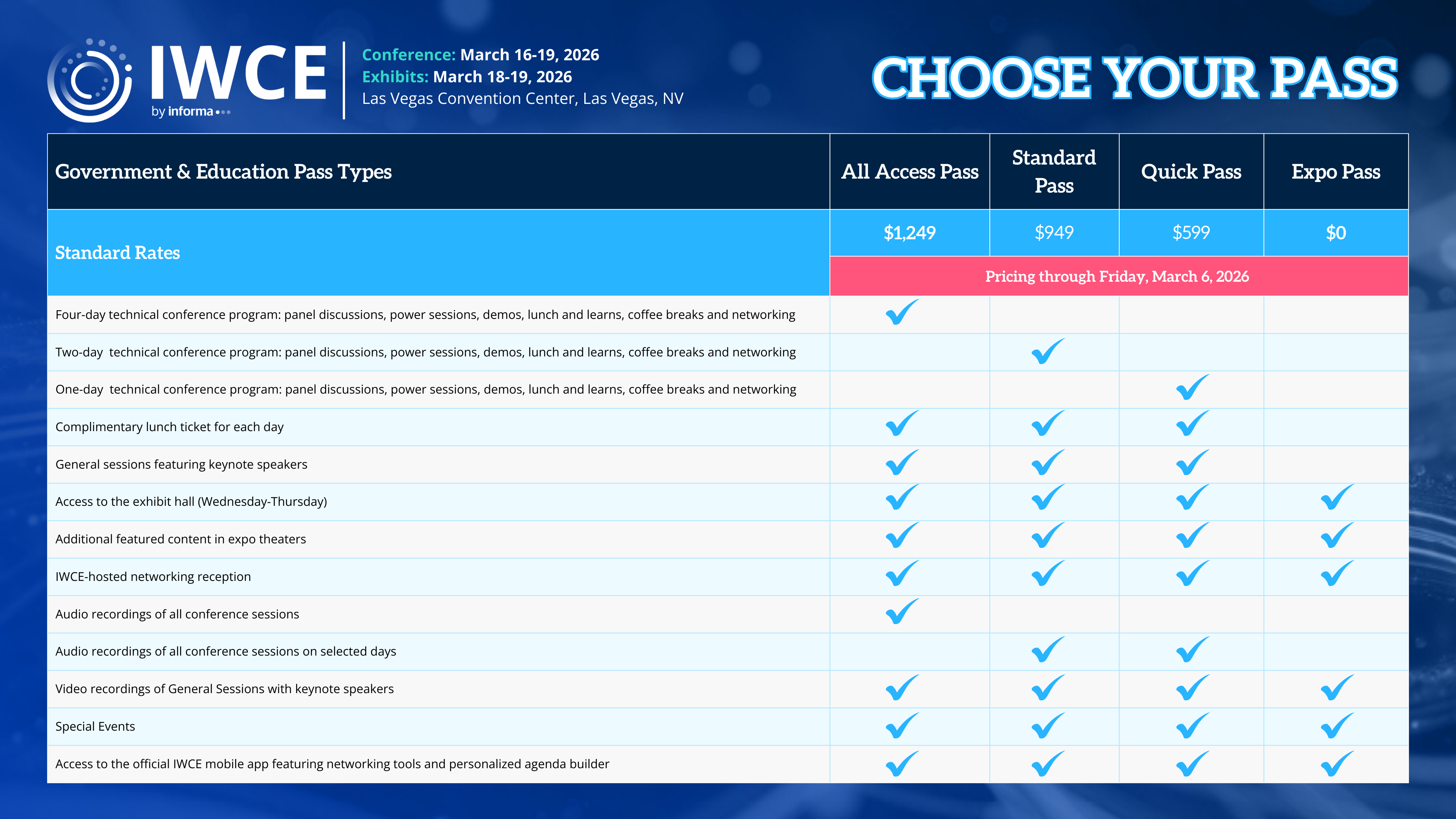 Attend IWCE 2026 with one of four government pass options. Valid for government emails: .gov, .edu, .us, .org, .mil. *Additional promotional codes are not applicable on government rates*