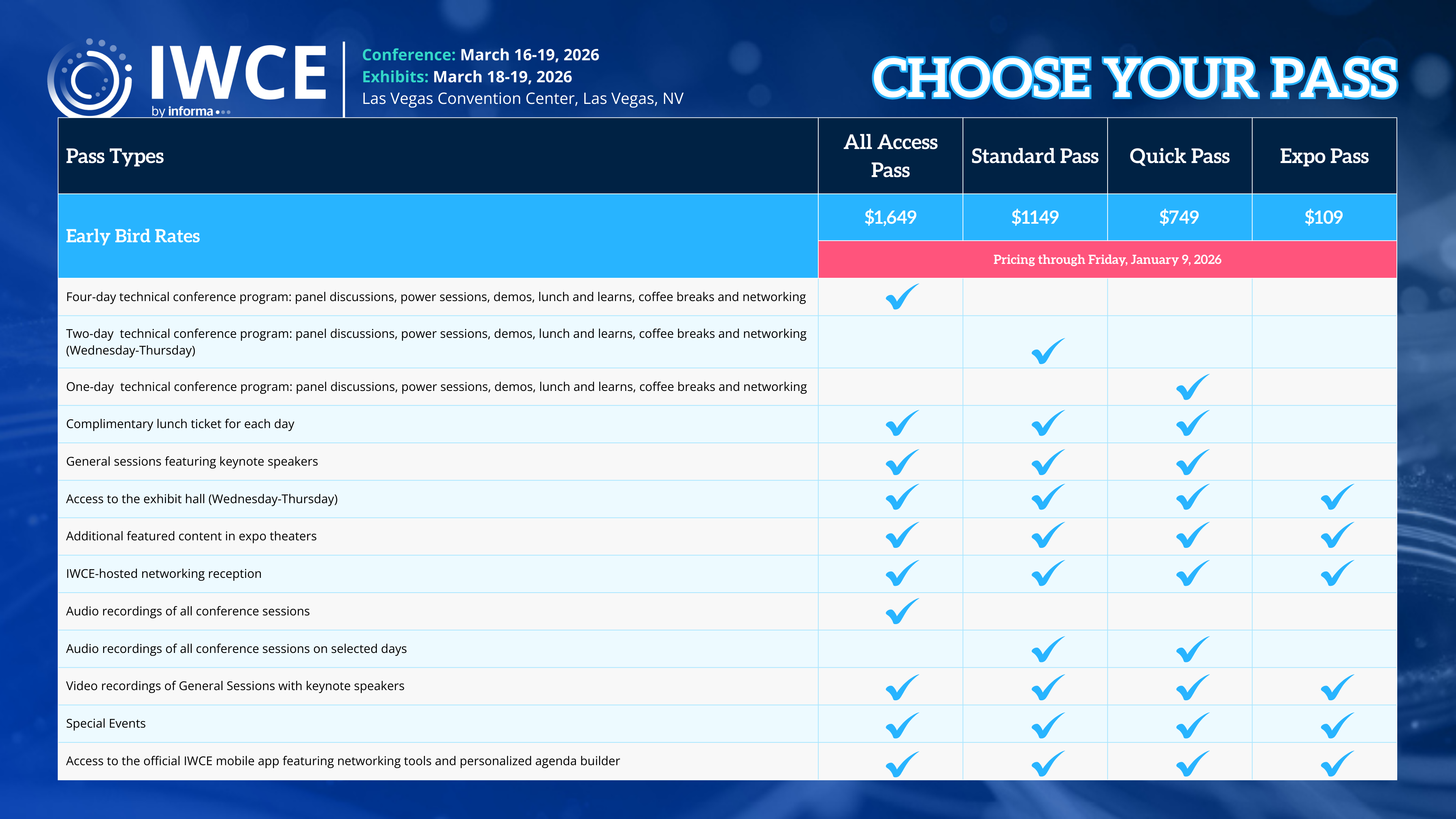 Our best rates of the year are available now through December 31, 2025. Attend IWCE 2026 with one of four government pass options. Valid for government emails: .gov, .edu, .us, .org, .mil. *Additional promotional codes are not applicable on government rates*